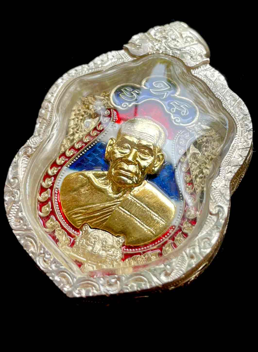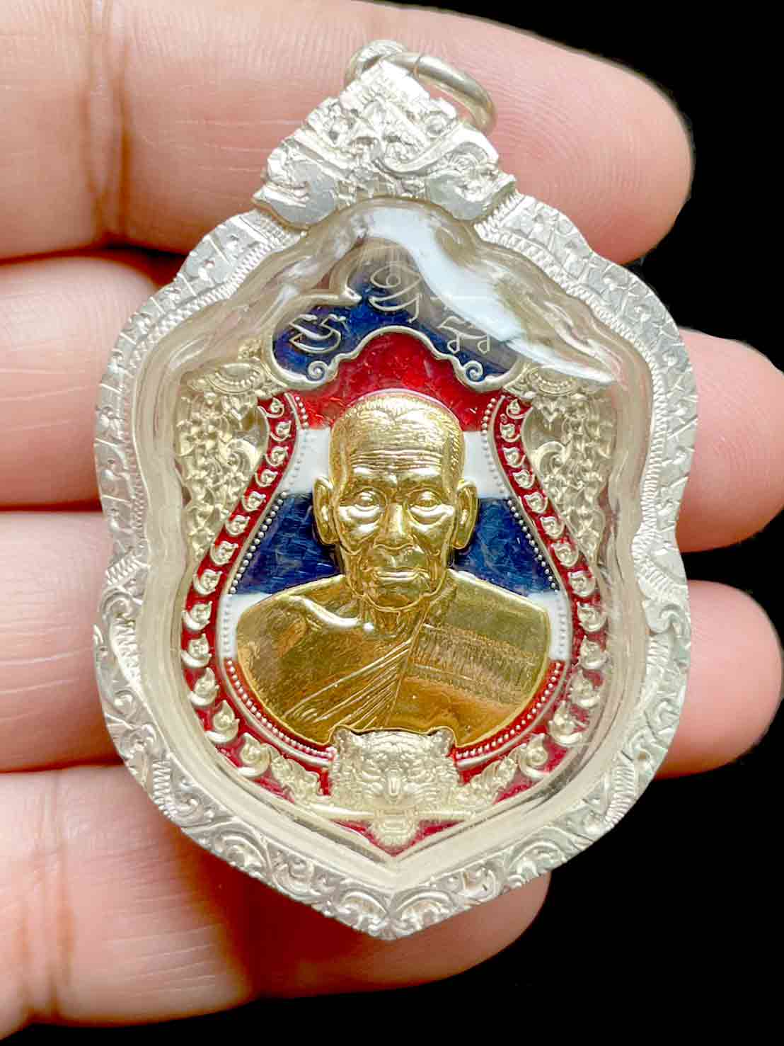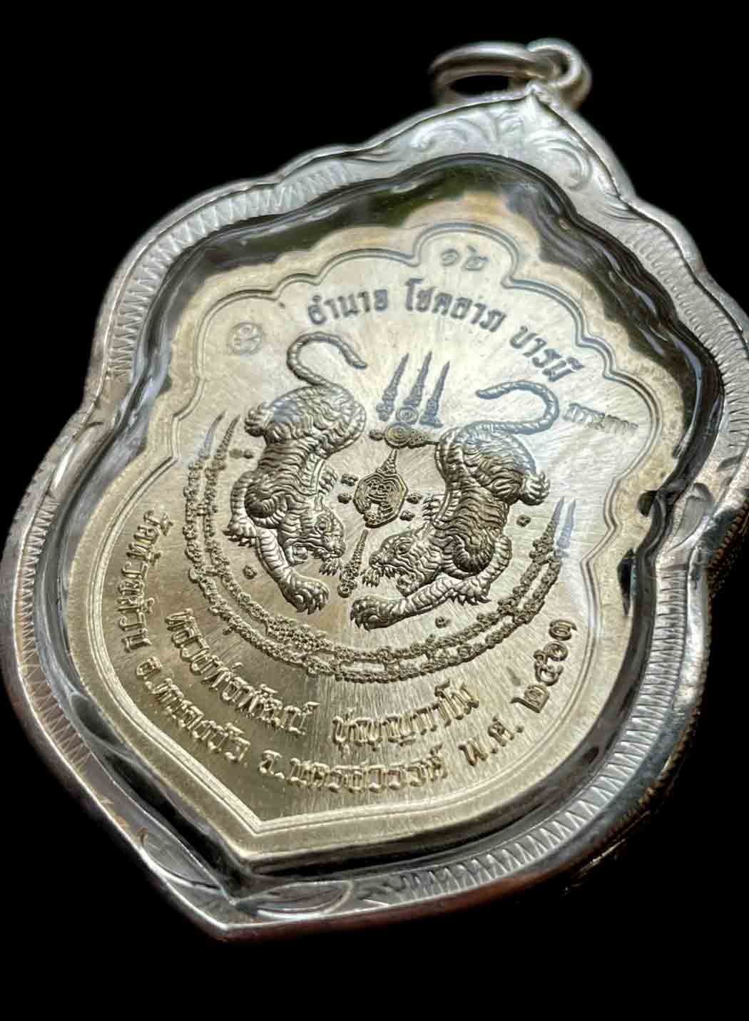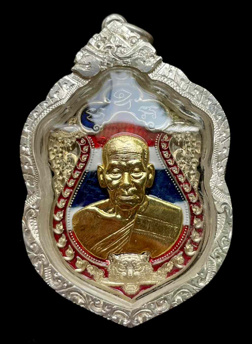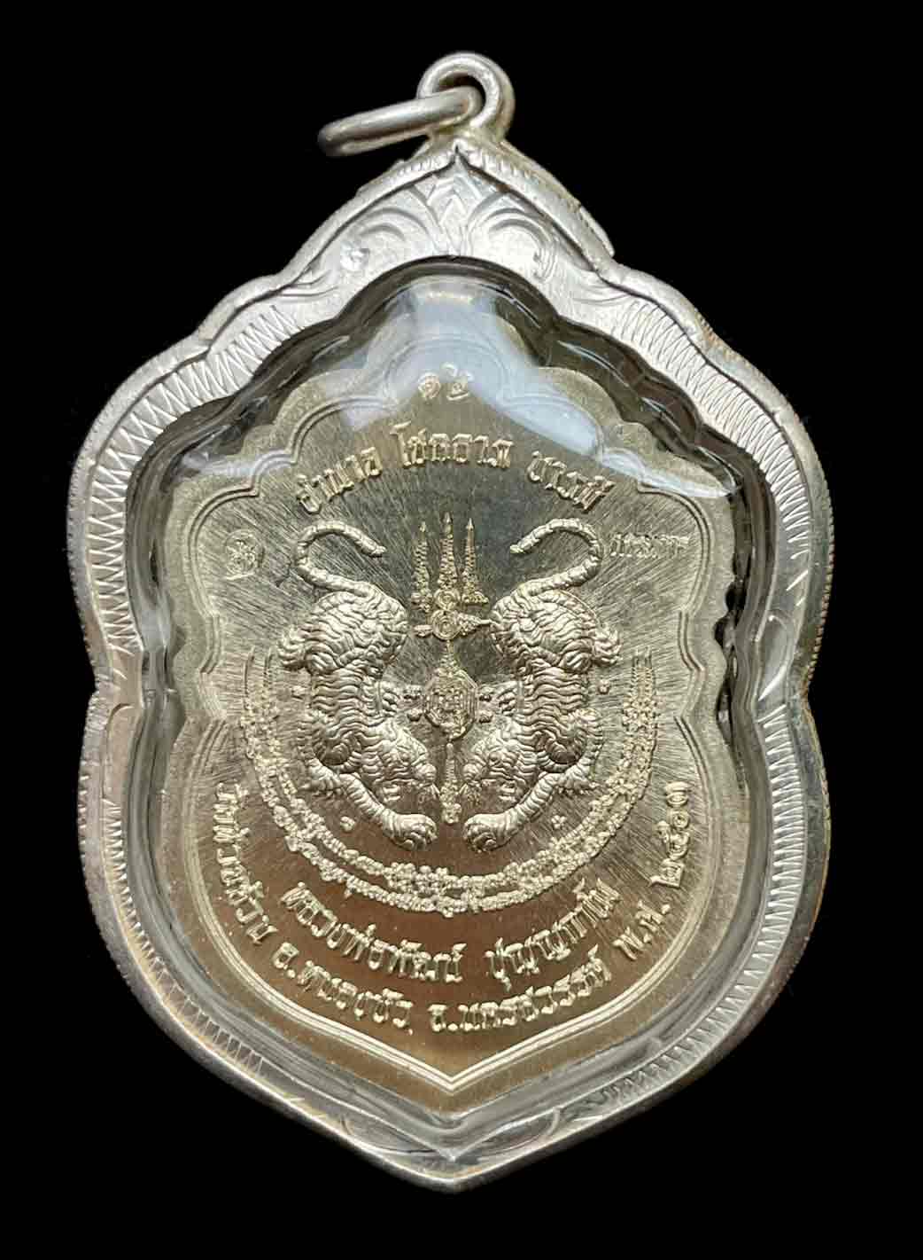 วัดใจ เหรียญเสมาเสือคาบดาบ รุ่น 2 หลวงพ่อพัฒน์ วัดห้วยด้วน จ.นครสวรรค์ เนื้ออาปาก้าลงยาธงชาติ หน้ากากชุบทอง โค๊ต กรรมการ เลข 12 เลี่ยมเงินแท้ สวยงาม