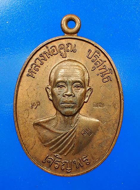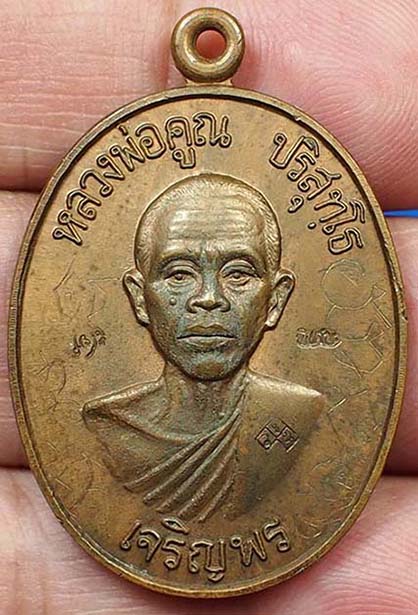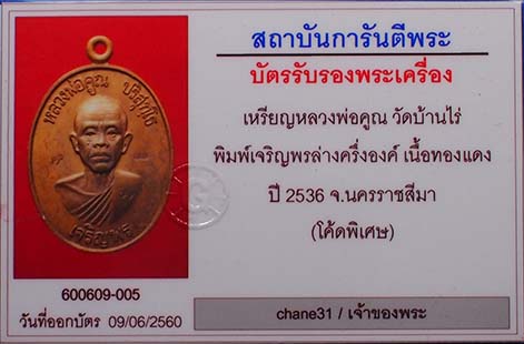 เหรียญหลวงพ่อคูณ วัดบ้านไร่ พิมพ์เจริญพรล่าง ครึ่งองค์ เนื้อทองแดง ปี 2536 จ.นครราชสีมา (โค้ดพิเศษ) มีจาร หน้า หลัง พร้อมบัตรรับรองสถาบันการันตีพระ