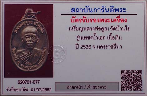 เหรียญหลวงพ่อคูณ วัดบ้านไร่ รุ่นเพชรน้ำเอก เนื้อเงิน ปี 2536 จ.นครราชสีมา พร้อมกล่องเดิม และบัตรรับรองสถาบันการันตีพระ รับประกันตามกฎ G พระ ทุกประการครับ