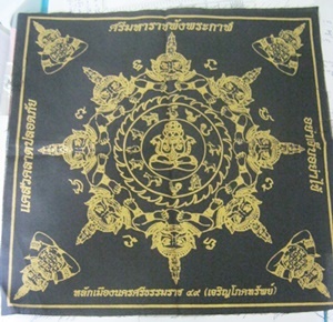 ผ้ายันต์ศรีมหาราชพังพระกาฬ หลักเมืองนครศรีฯ รุ่นเจริญโภคทรัพย์ปี๔๙ ขนาด๑๒x๑๒นิ้ว พื้นดำลายทอง สวยชัด รับประกันครับ