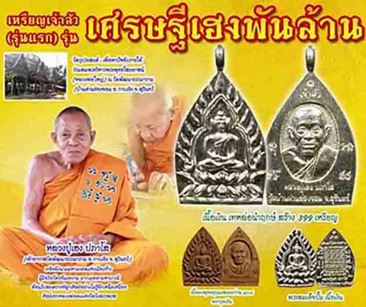 พระผงเจ้าสัว ๑ (รุ่นแรก) รุ่นเศรษฐีเฮงพันล้าน หลวงปู่เฮง ปภาโส วัดพัฒนาธรรมมาราม อ.กาบเชิง จ.สุรินทร์ พุทธาภิเษกเมื่อ วันพุธ ที่ 1 พฤศจิกายน 2560 (ขึ้น ๑๓ ค่ำ เดือน ๑๒ ปีระกา ราชาฤกษ์) เนื้อผงพุทธคุณผสมว่านกายสิทธิ์ เกศา,ตะกรุดเงิน + ตะกรุดทองแดง โค๊ด เฮง (ภาษาจีน)