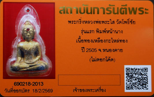 หลวงพ่อพระใส รุ่นแรก ปี2505 วัดโพธิ์ชัย จ.หนองคาย พิมพ์สมาธิ เนื้อทองเหลืองกระไหล่ทอง ในเลี่ยมเดิม ฝังพลอยแดงเดิมๆ หลวงพ่อพระใสเป็นพระพุทธรูปศักดิ์สิทธิ์คู่บ้านคู่เมือง ประดิษฐานอู่ที่วัดโพธิ์ชัย ซึ่งเป็นพระอารามหลวงในเมืองหนองคาย สำหรับวัตถุมงคลของหลวงพระใสนั้นได้ถูกสร้างออกมาหลายรุ่น หลายพิมพ์ ซึ่งแต่ละรุ่นต่างก็ได้รับความนิยม และสร้างประสบการณ์ที่ดีแก่ผู้บูชามากมาย พุทธคุณของพระหลวงพ่อพระใสนั้นโดดเด่นด้านโชคลาภ มีกินมีใช้ไม่อดอยาก ทำงานยากให้สำเร็จลุล่วงด้วยดี ไม่มีอุปสรรค์มาขัดขวาง หากมีก็ถูกขจัดปัดเป่าออกไป ได้รับการคุ้มครองป้องกัน