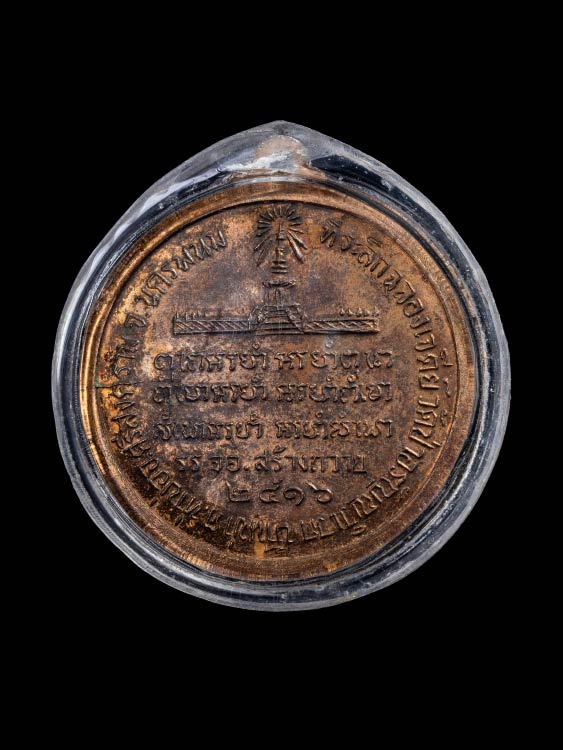 ด้านหลังเหรียญ ประดิษฐานรูปเจดีย์ ด้านล่างมีอักขระเรียงกัน 3 แถว ถัดลงมาระบุ รร.จอ. สร้างถวาย ๒๕๑๖ ขอบเหรียญจากขวาไปซ้ายสลักคำว่า ที่ระลึกฉลองเจดีย์วัดป่าอรัญญวิเวก ต.ท่าบ่อ อ.ศรีสงคราม จ.นครพนม
