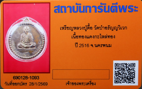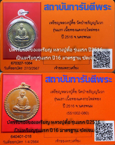 บัตรรับรองเหรียญที่เคยส่งออกบัตร ระบุ เหรียญ "รุ่นแรก" หลวงปู่ตื้อ อจลธมฺโม พ.ศ. 2516 มาตรฐาน ชัดเจนแน่นอนครับ.