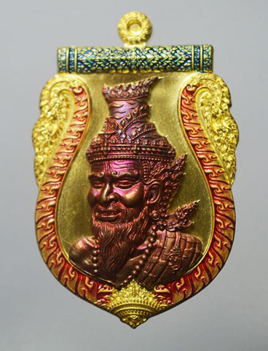 เหรียญเสมาพ่อปู่ฤาษี รุ่น บูชาครู ปลุกเสก พระอาจารย์ประสูติ วัดในเตา ,อาจารย์เทียม วัดหนัง รก.31 เนื้อชุบทองโบราณ หน้ากากนวะ ลงยาขอบแดง เลข 179
