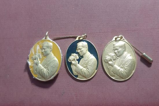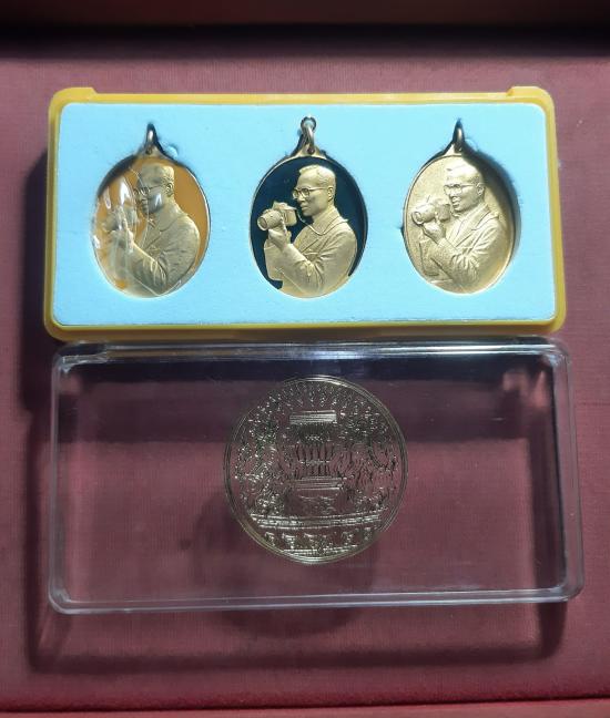 กล่องชุด 3 องค์ เหรียญในหลวงรัชกาลที่ 9 ทรงกล้อง กล่องเดิม (ขากล่องหัก)