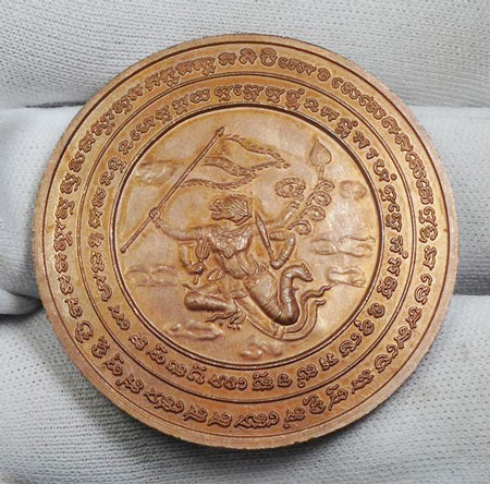 เหรียญที่ผมนำมาเสนอแก่ท่านสมาชิกนี้เรียกว่า เหรียญทำน้ำมนต์ หรือเหรียญบาตรน้ำมนต์ หลวงพ่อกวย หลังหนุมานเชิญธง เนื้อทองแดง ตอกโค๊ด 3 โค๊ด สภาพสวยจัด แท้แบบตาเปล่าเลยครับ ความพิเศษของวัตถุมงคลรุ่นนี้คือ ได้มีสุดยอดพระอริยะสงฆ์อย่าง หลวงปู่หมุนปลุกเสก ที่วัดซับลำใยสามัคคีธรรม จ.ลพบุรี หลายวาระครับ เหรียญตอกโค้ตและหมายเลขกำกับทุกเหรียญ ปัจจุบัน สภาพเหรียญสวยๆ หายากพอสมควร เพราะใครมีต่างหวงแหน ไม่ค่อยอยากปล่อยให้หลุดมือ อีกทั้งราคายังไม่แพงจนเกินไป จัดว่าเป็นเหรียญที่น่าใช้และสะสมเป็นอย่างยิ่งครับ ..สำหรับช่วงที่พระอาจารย์ตั้ว ศิษย์เอกหลวงพ่อกวยตระเวนหาพระอาจารย์ที่เก่งๆ ได้เข้าไปกราบหลวงตามหาบัว และขอของดีจากท่าน ปรากฏว่าท่านบอกว่าไม่มี ถ้าชอบในวัตถุมงคลอิทธิปาฏิหาริย์ให้ไปหาหลวงตาหมุนโน่น ซึ่งกว่าพระอาจารย์ตั้วจะพบเจอหลวงปู่หมุนและฝากตัวเป็นศิษย์ของท่าน ใช้เวลาถึง 15 ปี กว่าจะได้เจอ และมีช่วงหนึ่งของการสนทนา พระอาจารย์ตั้วได้เรียนถามหลวงปู่ว่า หลวงปู่รู้จัก หลวงพ่อกวยไหม ท่านตอบว่ารู้จักซิ องค์นี้เก่ง เคยพบกันในป่า ซึ่งคำตอบนี้ยังความปลื้มปีติแก่พระอาจารย์ตั้วเป็นอย่างมาก เพราะก่อนหน้านั้นหลวงพ่อกวยสมัยที่ท่านยังมีชีวิตอยู่ ท่านได้บอกกับพระอาจารย์ตั้วว่า มีพระที่เก่งมากอยู่รูปหนึ่งอยู่ในป่าแถบขอนแก่น ท่านสำเร็จแล้ว หากมีโอกาสต้องไปหาท่านให้พบ ชื่อหลวงพ่อหมุน ซึ่งเป็นคำบอกเล่าของหลวงพ่อกวยโดยตรง ..สำหรับเหรียญรุ่นนี้ถูกสร้างขึ้นใน ปีพ.ศ. ๒๕๔๒ ขนาดเหรียญบาตรน้ำมนต์ มีทั้งเหรียญพุทธนิมิตร เหรียญหลวงพ่อกวย ที่เป็นรูปหลวงพ่อกวยนั่งทำมนต์ เหรียญอาร์มหลวงพ่อกวยหลังยันต์พระเจ้า และเหรียญอาร์มหลวงพ่อกวยหลังหนุมาณเชิญธง มีหลายพิมพ์ หลายเนื้อ โดยพระครูสมุห์ภาพ (พระอาจารย์ตั้ว) ลูกศิษย์สาย หลวงพ่อกวย เป็นผู้สร้าง และหลวงปู่หมุน วัดบ้านจาน จ.ศรีสะเกษ ได้ปลุกเสกอีกหลายวาระ รวม5วาระ ดังนี้ (1.)พิธีพุทธาภิเษกในปี ๒๕๔๒ (2.)ปี ๒๕๔๓ ในพิธีมหาสมปรารถนา (3.)ปี ๒๕๔๔ หลวงปู่หมุนปลุกเสกเดี่ยวในงานสรงน้ำประจำปี วัดซับลำใย จ.ลพบุรี (4.)ปี๒๕๔๔ ในพิธี ๙ แผ่นดินมหาสมปรารถนา (5.)ปี ๒๕๔๕ หลวงปู่หมุนปลุกเสกเดี่ยวในงานสรงน้ำประจำปี วัดซับลำใย จ.ลพบุรี อีกครั้ง ..สาเหตุที่ปลุกเสกหลายครั้งเนื่องจากเมื่อก่อน วัตถุมงคลวัดซับลำใยยังไม่ได้รับความนิยมเหมือนในปัจจุบัน พระอาจารย์ตั้วจึงนำวัตถุมงคลที่เหลือเป็นจำนวนมากเข้าพิธีปลุกเสกทุกครั้งที่หลวงปู่หมุนเดินทางมาวัดซับลำใย จึงเป็นเหรียญที่น่าใช้มาก
