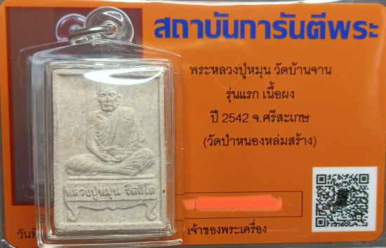 พระหลวงปู่หมุน วัดบ้านจาน รุ่นแรก(นั่งตั๋ง) เนื้อผง ปี2542 จ.ศรีสะเกษ พร้อมบัตรรับรอง |