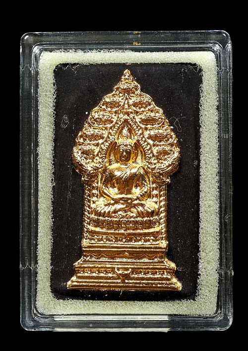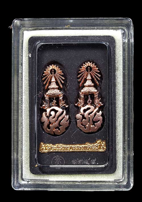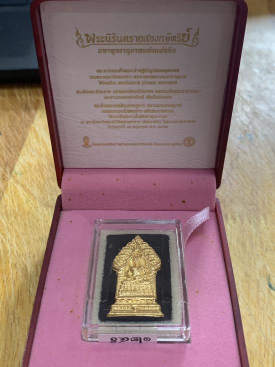 พระนิรันตรายสองกษัตริย์ มหาพุทธานุภาพแห่งแผ่นดิน เนื้อผง (สีดำ) หน้าปัดทอง หลังฝังนวะโลหะชุบนาก (พระปรมาภิไธยย่อสองกษัตริย์) ขนาดสูง 3.2 เซน ปี2552 เลขสวย 1249 พร้อมกล่องเดิมครับ