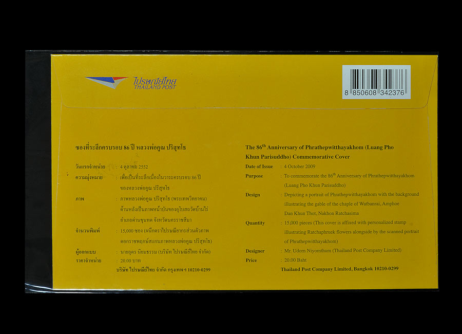 ซองที่ระลึกครบรอบ 86 ปี หลวงพ่อคูณ กูให้มึงรักกัน ( ประทับตรา 3 ตรา พิเศษ ) พ.ศ.2552 ( ติดแสตมป์ 2 ดวง ภาพหลวงพ่อคูณ และ ดอกราชพฤกษ์ )