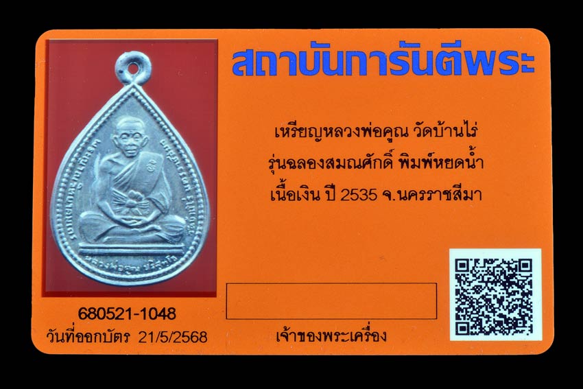 ++บัตรรับรองพระแท้ สถาบันการันตีพระ , ออกบัตรเมื่อ 21/5/2568