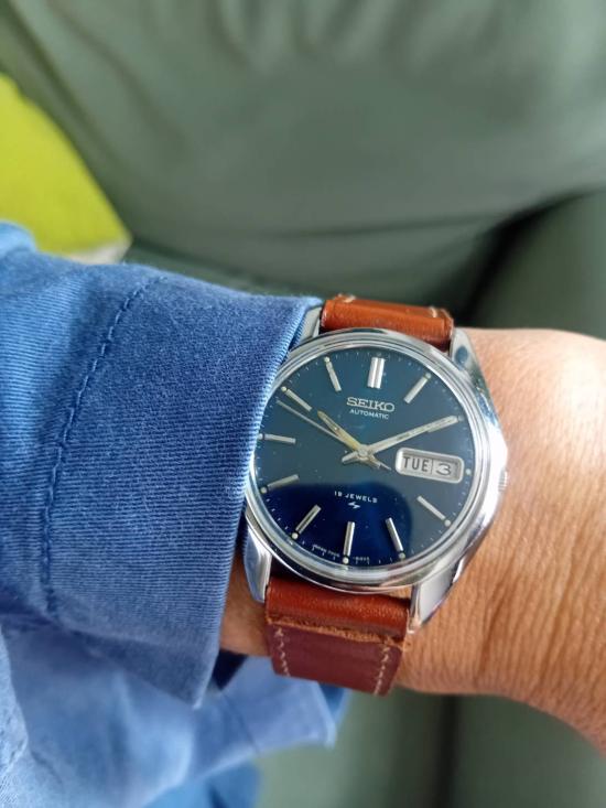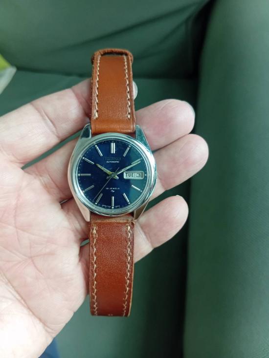 seiko auto เดินปกติ ขนาด 36 มม พร้อมสายหนังสีน้ำตาล หนัาปัดสีน้ำเงิน