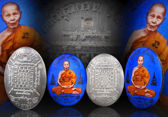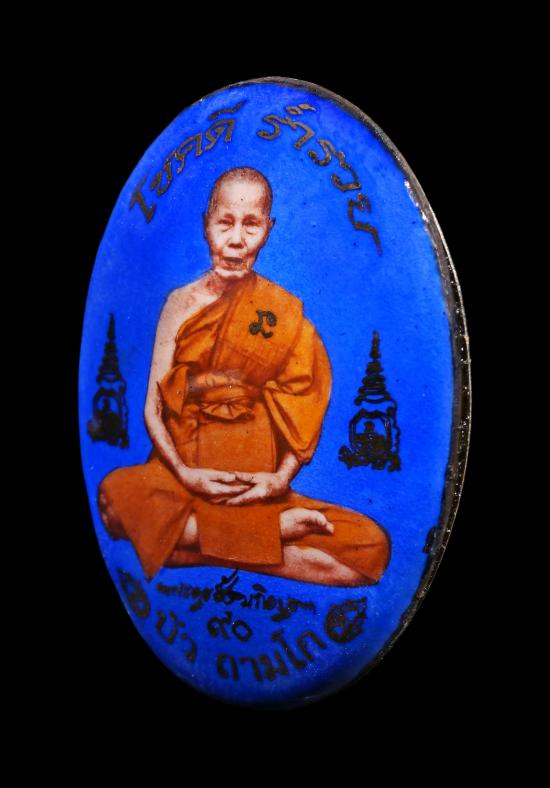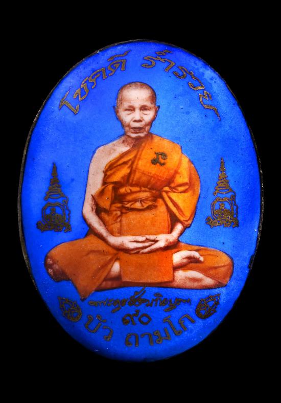 ล็อกเก็ตฉากน้ำเงิน พิมพ์ทองหลังเงิน รุ่นโสฬสมงคล 90 ปี โชดดีร่ำรวย หมายเลข2พระครูสังฆกิจบูรพา(หลวงปู่บัว ถามโก) วัดศรีบุรพาราม(เกาะตะเคียน) จ.ตราด
