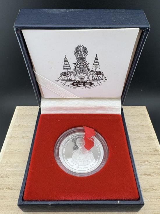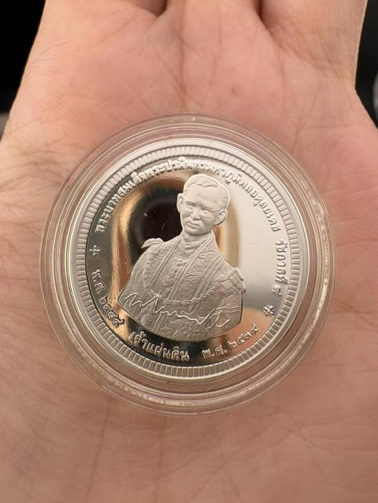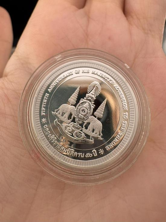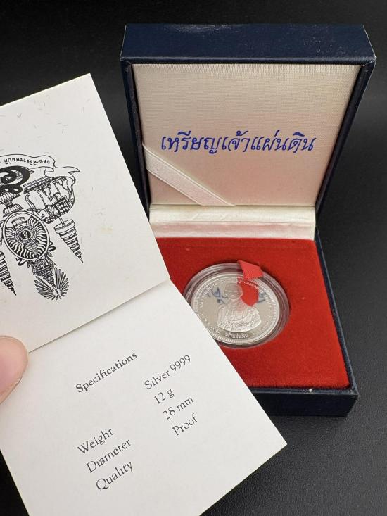เหรียญเจ้าแผ่นดิน ที่ระลึกทรงครองสิริราชสมบัติครบ 50 ปี ในหลวงรัชกาลที่ 9 เนื้อเงิน 99.99% ขัดเงา 3 มิติ หมายเลข 14575 พร้อมกล่องเดิม