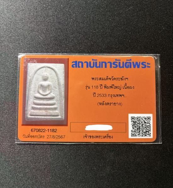 สมเด็จวัดระฆัง 118 ปี พิมพ์ใหญ่หลังตรายาง พร้อมบัตรรับรองครับ |
