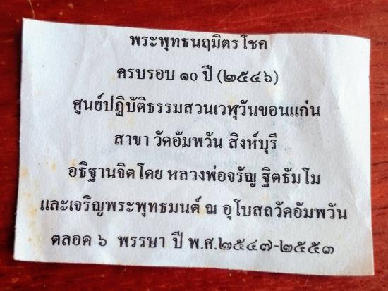 พระพุทธนฤมิตรโชค (กวางเล็ก) ครบรอบ 10 ปี ศูนย์ปฏิบัติธรรมสวนเวฬุวันขอนแก่น สาขาวัดอัมพวัน จังหวัดสิงห์บุรี ปี46 หลวงพ่อจรัญ วัดอัมพวัน ปลุกเสก