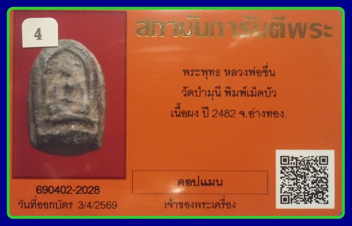 บัตรการันตี -600-พระพุทธเม็ดบัว หลวงพ่อชื่น วัดป่ามุนี จ.อ่างทอง เนื้อผงว่าน พศ.2482