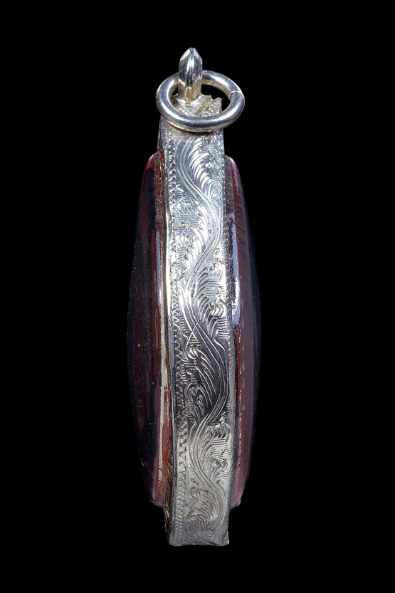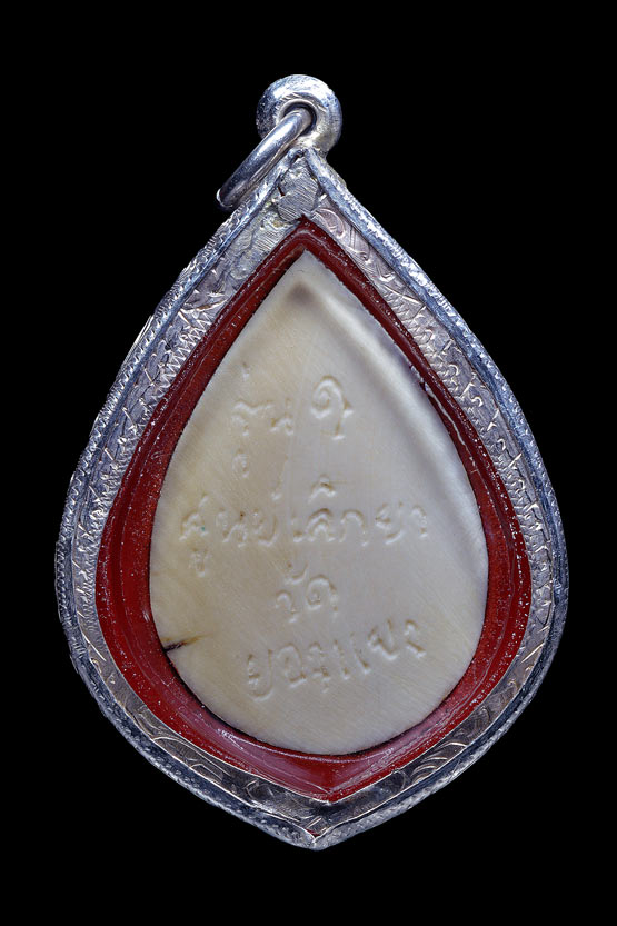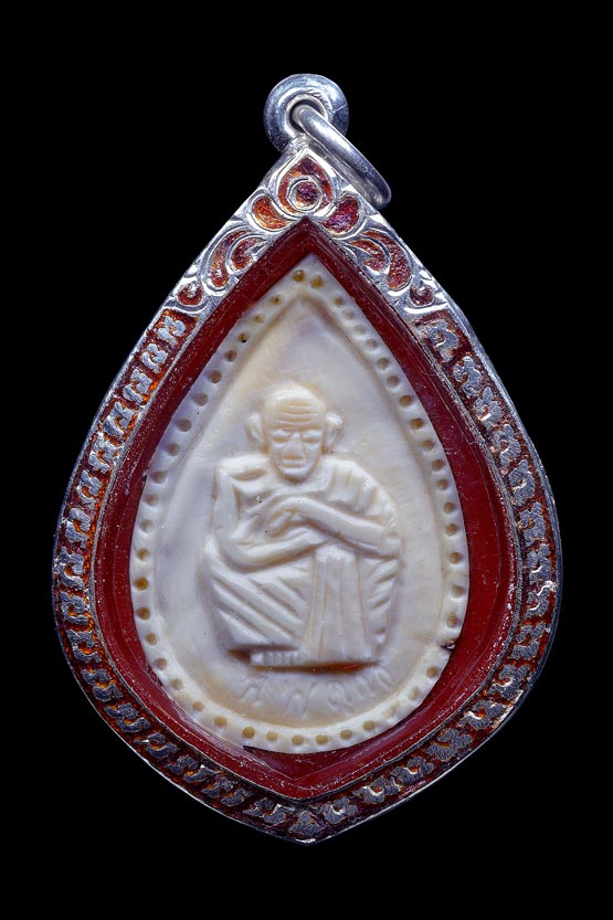รูปเหมือนนั่งยองเนื้องาแกะสลัก ( พิมพ์หยดน้ำ , วัดองค์พระ 3.5 x 2.5 ซม. ) พ.ศ.2553 ( เลี่ยมกรอบเงิน )