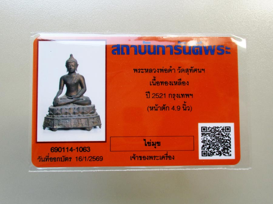 พระบูชาหลวงพ่อดำ วัดสุทัศน์ กรุงเทพฯ พ.ศ.2521 ฐานมีตรา ศปส. หน้าตัก 5 นิ้ว เนื้อทองเหลือง ผิวแห้งหิ้ง พร้อมบัตรรับรองการันตีพระ !!