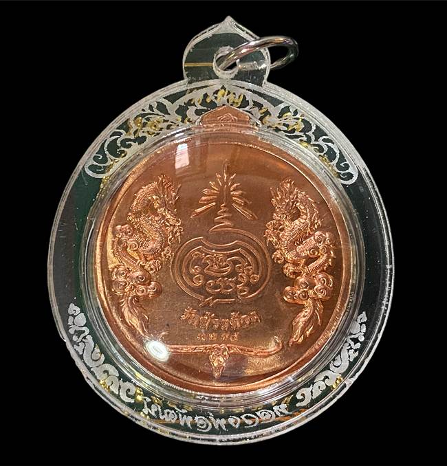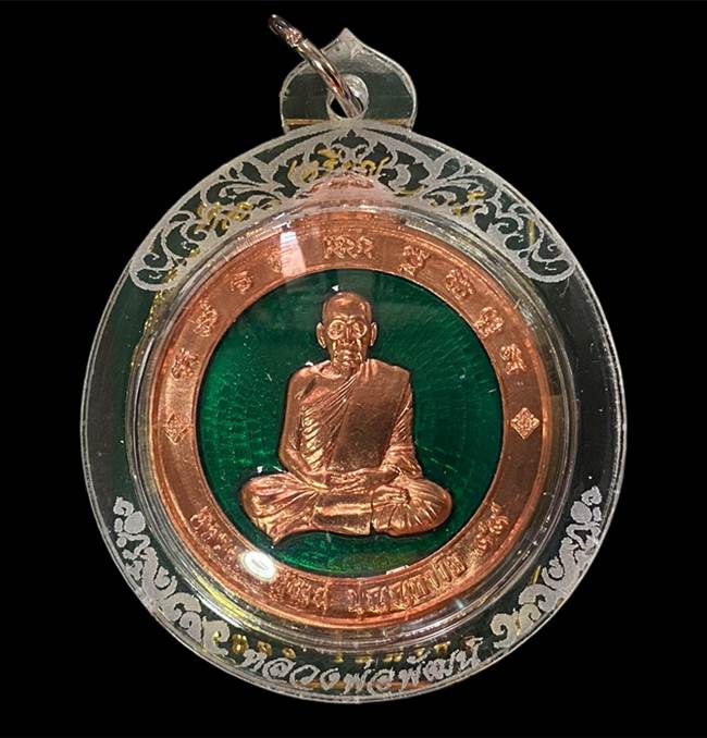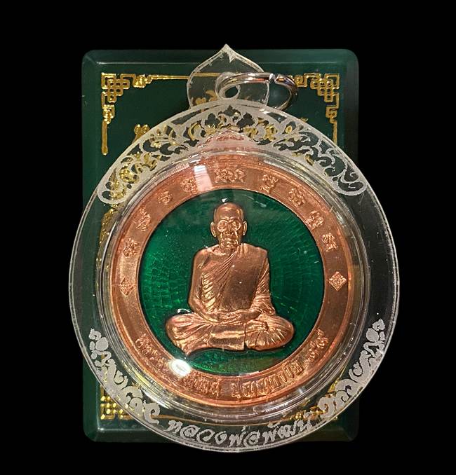 "งานเลี่ยมเลเซอร์กันน้ำ" สวย สวย เหรียญจิ๊กโก๋ ปากน้ำโพ หลวงพ่อพัฒน์ วัดห้วยด้วน เนื้อทองแดงลงยาเขียว พิมพ์ใหญ่ # 3295 กล่องครบครับ