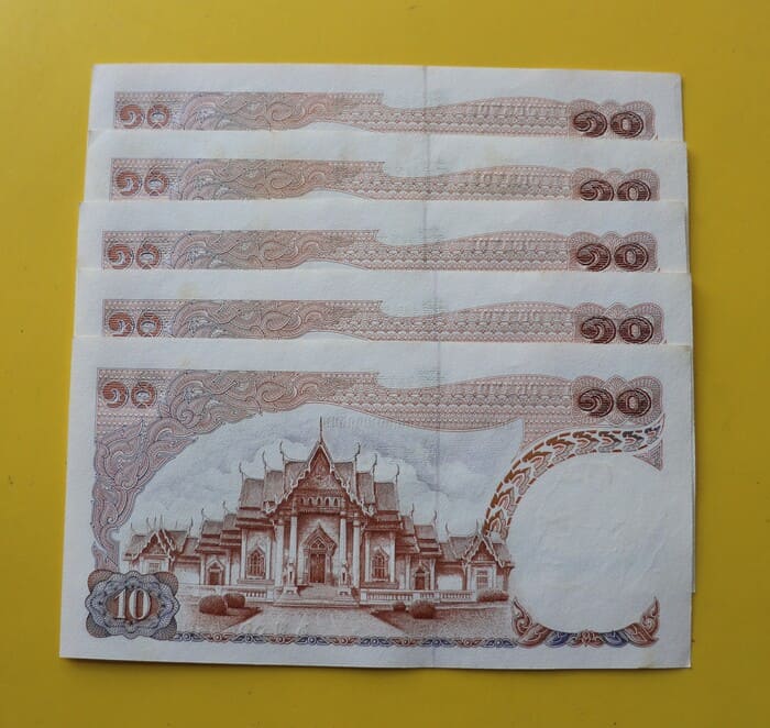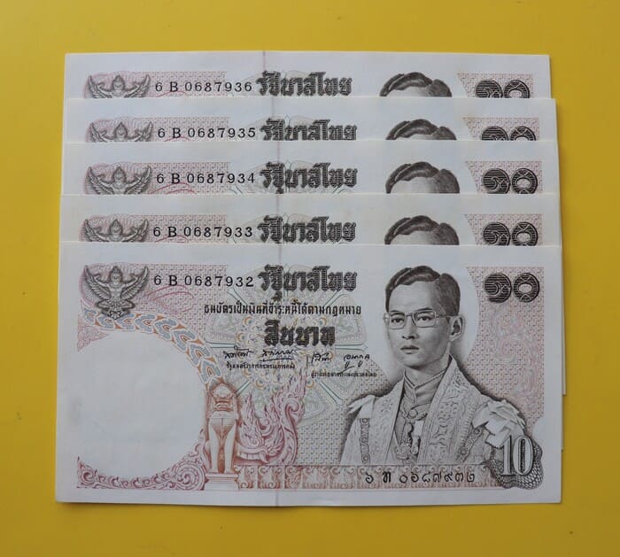 ธนบัตรแบงค์ 10 บาท แบบ 11 หลังวัดเบญจมบพิตร 5 ฉบับ เลขเรียง 6 B 0687932-6 UNC ไม่ผ่านการใช้