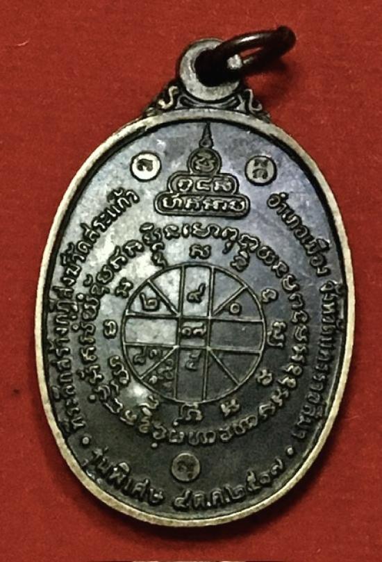 ด้านหลังเหรียญตรงกลางเป็นอักขระยันต์ มีข้อความล้อมรอบว่า ที่ระลึกสร้างกุฎิสงฆ์วัดสระแก้ว อำเภอเมือง จังหวัดนครราชสีมา รุ่นพิเศษ ๔ ต.ค.๒๕๑๗