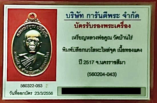 เหรียญหลวงพ่อคูณ ปริสุทโธ วัดบ้านไร่ ปี 2517 เนื้อทองแดง บล็อคนวโลหะไหล่จุด ด.จุด (บล็อคนิยมสูงสุด)++พร้อมบัตรรับรองพระแท้