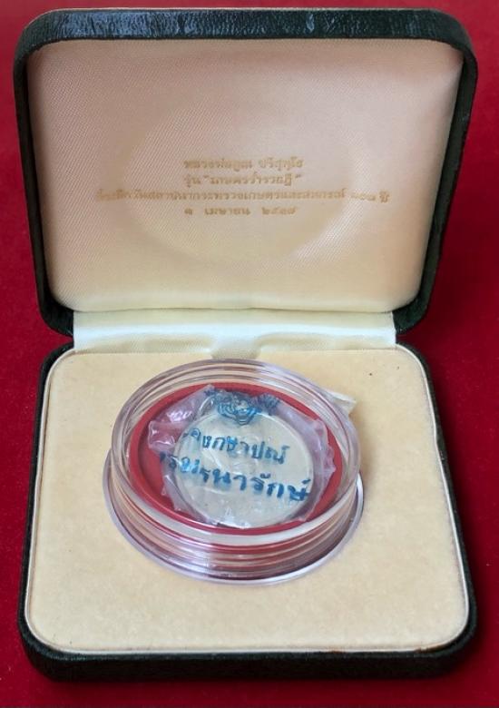 หลวงพ่อคูณ เหรียญเนื้อเงิน รุ่นเกษตรร่ำรวยฎี บล็อคกองกษาปณ์ ที่ระลึกวันสถาปนากระทรวงเกษตรฯ ปี38 พร้อมกล่อง