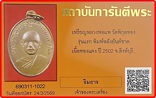 เหรียญหลวงพ่อแพ วัดพิกุลทอง รุ่นแรก ปี2502 พิมพ์หลังยันต์ขาด มีบัตรรับรองจีพระ เคาะเดียว