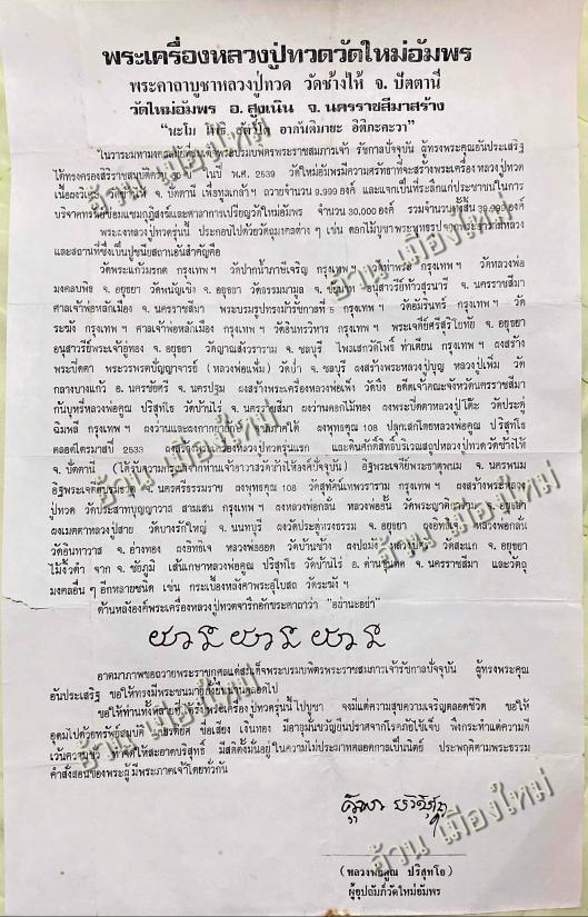 ++วัตถุประสงค์ : ในวาระมหามงคลสมัยที่สมเด็จพระบรมบพิตรพระราชสมภารเจ้า รัชกาลที่ 9 ผู้ทรงพระคุณอันประเสริฐ ไห้ทรงครองสิริราชสมบัติครบ 5O ปี ในปี พ.ศ.2539 วัดใหม่อัมพร มีความศรัทธาที่จะสร้างพระเครื่อง หลวงปู่ทวด เนื้อผงวิเศษ เพื่อทูลเกล้าฯ ถวายจํานวน 9999 องค์ และแจกเป็นที่ระลึกแก่ประชาชนในการบริจาคทรัพย์ซ่อมแซมกุฏิสงฆ์และศาลาการเปรียญวัดใหม่อัมพร จำนวน 30000 องค์ รวมจํานวนทั้งสิ้น 39999 องค์