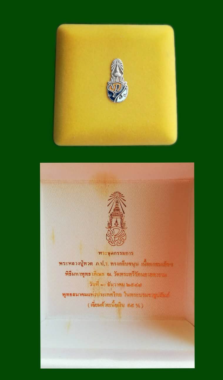 หลวงปู่ทวด พิมพ์ทรงกลีบขนุน เนื้อว่าน ด้านหลัง ภปร. ที่ระลึกสร้างอาคาร "ศาสตราจารย์สัญญา ธรรมศักดิ์" ด้านหลังอัญเชิญอักษรพระปรมาภิไธย ภปร. มาประดิษฐานไว้ พิธีพุทธาภิเษกใหญ่ที่ วัดพระแก้ว 10 ธ.ค.47 หุ้มด้วยทองนพเก้า สภาพสวยๆ มาพร้อมกล่องกำมะหยี่สีน้ำตาลเข้ม พระสวยตามสภาพอายุกว่าสิบปี