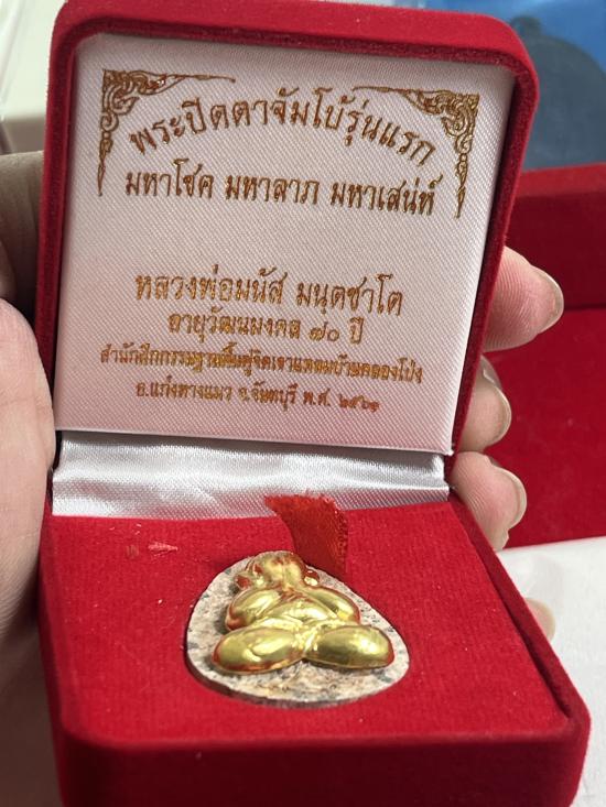 พระปิดตาจัมโบ้รุ่นแรกหลวงพ่อมนัส มนฺตชาโต บ้านคลองโป่ง จ.จันทบุรี อายุวัฒนมงคล ๗๐ ปี หน้ากากทองคำ และฝังตะกรุดทองคำสองดอก พร้อมกล่องเดิม