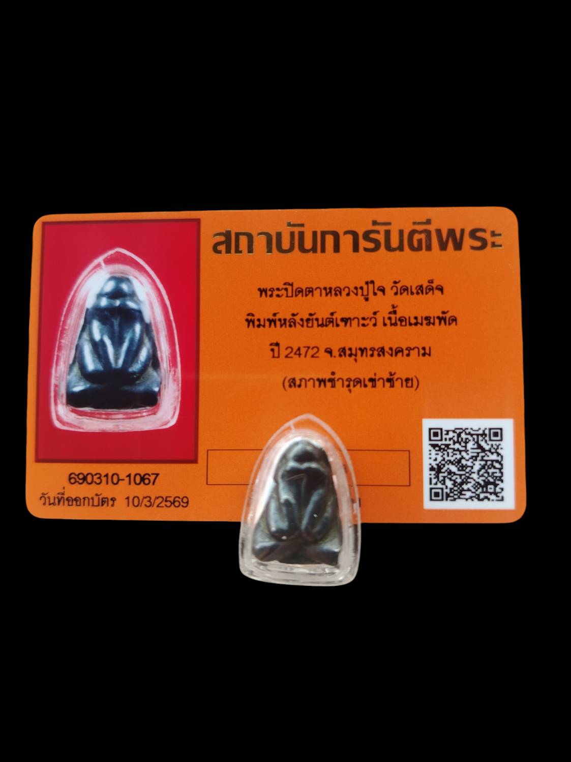 พระปิดตา หลวงปู่ใจ วัดเสด็จ เนื้อเมฆพัตร หลังยันต์เฑาะ ว์ มาพร้อมใบรับรอง มีชำรุดเข่าซ้าย เล็กน้อย