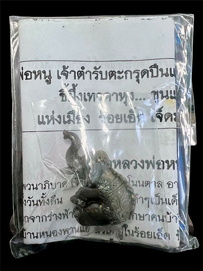 ตอนแรกหลวงพ่อหนูจะให้ใส่ตลับธรรมดา ลูกศิษย์หาตลับพลาสติกมา ใส่ไปแล้วแตกหมด ใส่ตลับไม้ก็มีลอยร้าวน้ำสีผึ้งไหล หลวงพ่อหนูจึง ตั้งจิตถามเทวดาว่า จะใส่ตลับอะไร ที่คู่ควรคำตอบที่ได้ตอบว่า ของนี้แรงขี้ผึ้งที่ไม่มีในโลก ให้ทำช้างตกมันมาบรรจุจึงใช้ได้ หลวงพ่อหนูจึงทำตลับเป็นรูปช้างพลายกลัดมันกำลังยกงวงชูงา นั่งกระดกก้นร้องเรียกช้างพัง (ช้างตัวเมีย) ปิดทองรับขวัญไว้