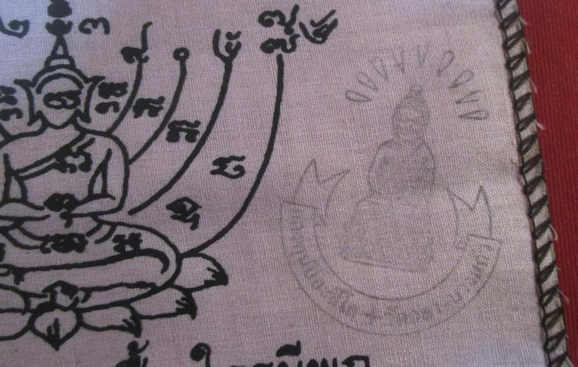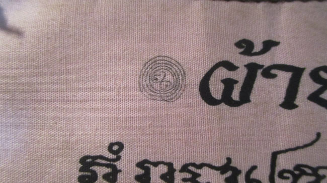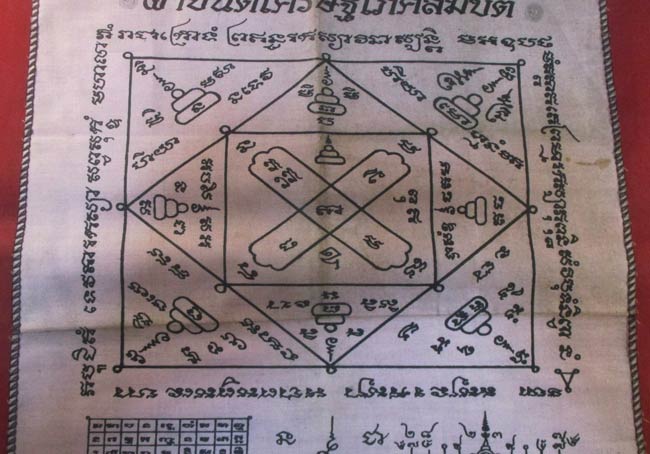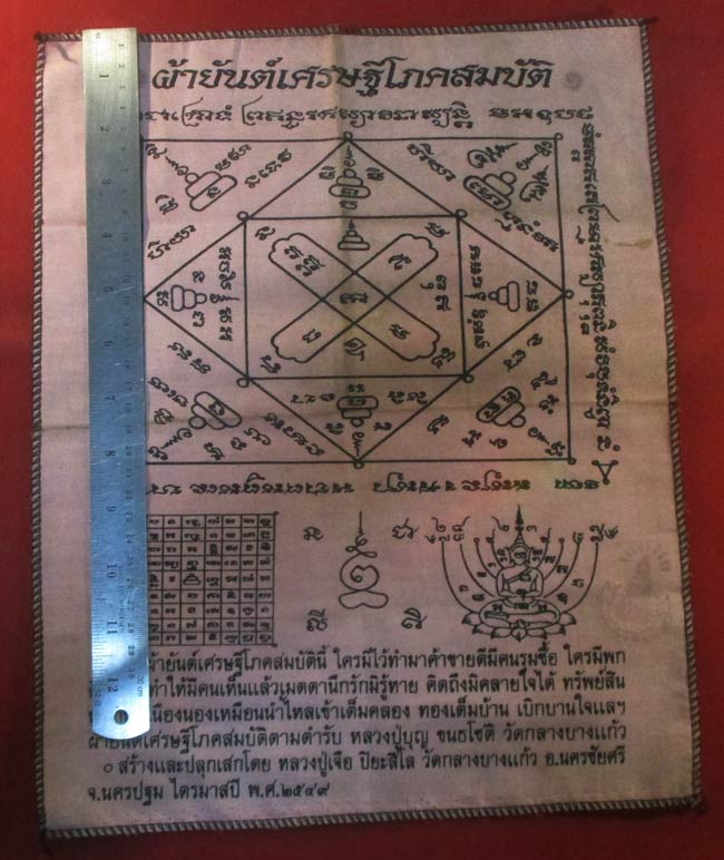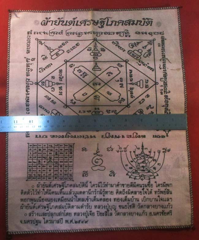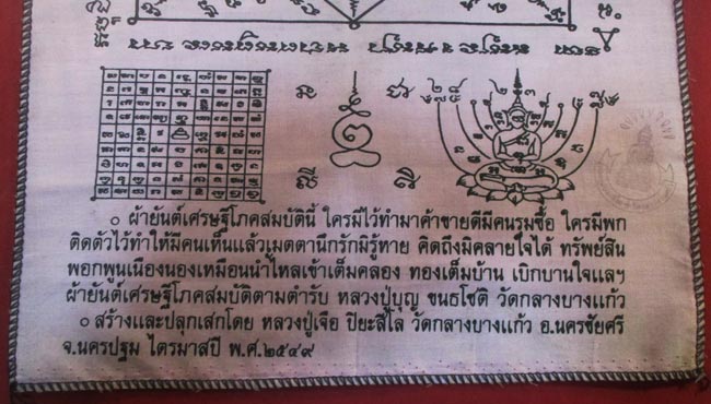 ผ้ายันต์ เศรษฐีโภคสมบัติ สร้างและปลุกเสกโดย หลวงปู่เจือ ปิยะสีโล วัดกลางบางแก้ว อ.นครชัยศรี จ.นครปฐม ไตรมาสปี พ.ศ.๒๕๔๙ ครับ