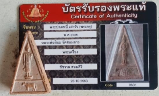 เคาะเดียว พระปลดหนี้ พิมพ์เต่าวัว หลวงพ่อผินะ วัดสนมลาว (พระแตกกรุ) ปี 2538 พร้อมบัตรรับรอง2ใบ จากวัดสนมลาว และ DD Pra