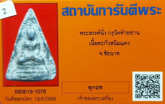 พระสรรค์นั่ง กรุวัดท้ายย่าน เนื้อตะกั่วสนิมแดง จ.ชัยนาท จัดเป็นพระพิมพ์ยอดนิยมของเมืองชัยนาท องค์นี้เป็นพระเนื้อตะกั่วสนิมแดง หายาก ส่วนมากเจอแต่เนื้อชินเงินกับเนื้อดิน พระสภาพสวย เต็มฟอร์ม รายละเอียดของพระ คม ชัด ลึก พระดูง่ายสบายตา พระสรรค์นั่งพุทธคุณดีเด่นในเรื่องความเหนียว แคล้วคลาด คงกะพันชาตรี น่าใช้มากครับ พระสภาพสมบูรณ์ หนาแข็งแรง ไม่มีอุด-ซ่อม ครับ