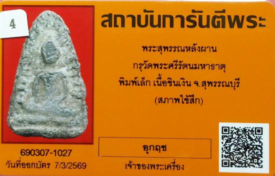 พระสุพรรณหลังผาน กรุวัดพระศรีรัตนมหาธาตุ พิมพ์เล็ก เนื้อชินเงิน จ.สุพรรณบุรี พร้อมบัตรรับรองจากจีพระ