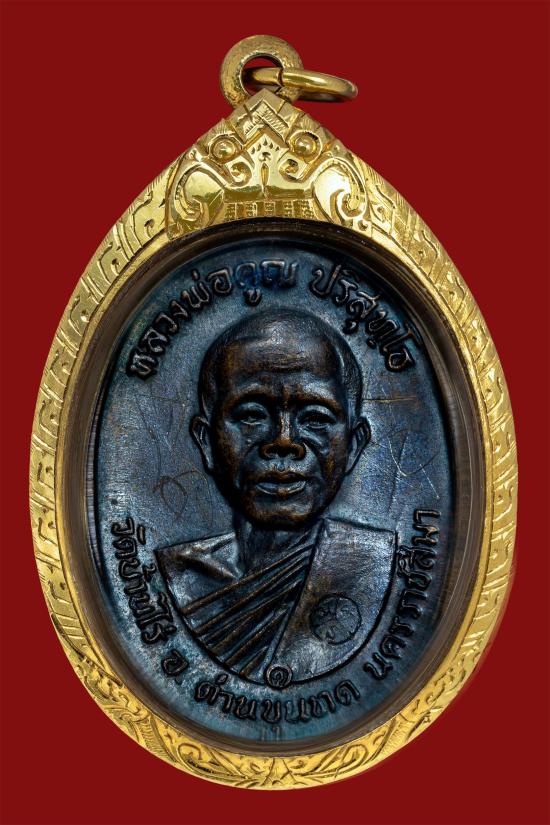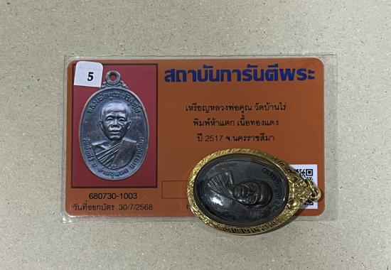 เหรียญหลวงพ่อคูณ ปี 2517 พิมพ์ห้าแตก เนื้อทองแดง พร้อมบัตร G เลี่ยมทองสวยๆหนัก 2.7 กรัม เช็ค%ทองได้ 70.40 %
