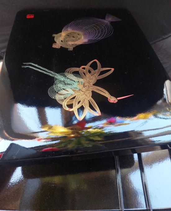 กล่องไม้เครื่องเขินญี่ปุ่น (Japanese lacquerware) ประเภทวาจิมะ-นูริ (Wajima-nuri) นกกระเรียนและเต่า" ซึ่งเป็นสัญลักษณ์ของการมีอายุยืนยาวและเป็นที่นิยมอย่างมากในวัฒนธรรมญี่ปุ่น