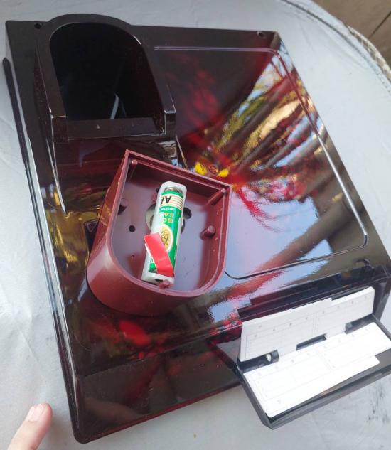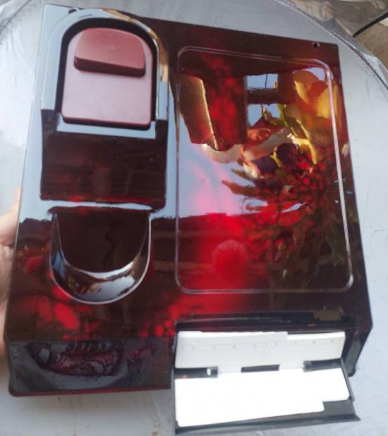 ทำจากพลาสติกสีแดงเข้มลักษณะคล้ายอะคริลิก