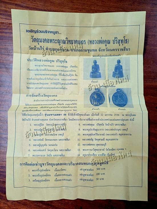 ++ปลุกเสก : ณ พระอุโบสถวัดบ้านไร่ อ.ด่านขุนทด จ.นครราชสีมา วันที่ 22 มกราคม พ.ศ.2536 โดยมีพระเกจิคณาจารย์ชื่อดังจากทั่วประเทศร่วมแผ่เมตตาปลุกเสก ดังนี้ หลวงปู่นิล วัดครบุรี จ.นครราชสีมา , หลวงปู่คง วัดตะคร้อ จ.นครราชสีมา , หลวงปู่คง วัดเขาสมโชช จ.ลพบุรี , หลวงพ่อดี วัดหนองจอก จ.นครราชสีมา , หลวงปู่บุญพัน จ.ขอนแก่น , หลวงพ่อเสาร์ วัดกุดเวียน จ.นครราชสีมา , พระมหานวล วัดบึง จ.นครราชสีมา , พระครูประดิษฐ์นวการ ( หลวงพ่อประมุข ) จ.ลพบุรี , พระครูสุนันท์วิริยาภรณ์ ( หลวงพ่อเก๋ ) จ.สมุทรสงคราม , หลวงพ่ออิฐ วัดจุฬามณี จ.สมุทรสงคราม , หลวงพ่อทอง จ.สุพรรณบุรี , พระภาวนาวิสุทธาจาจารย์ วัดไตรมิตร กรุงเทพฯ , ครูบาประเทือง นาถสีโล จ.เชียงใหม่ |