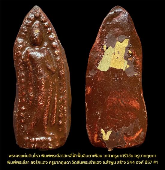 พระผงแผ่นดินไหว พิมพ์พระลีลาสะหลี๋ฟ้าฟื้นอินตาเฟือน เกศาครูบาศรีวิชัย ครูบากฤษดา พิมพ์พระลีลา ลงรักแดง ครูบากฤษดา วัดสันพระเจ้าแดง จ.ลำพูน สร้าง 244 องค์ ปี57 เคาะเดียว