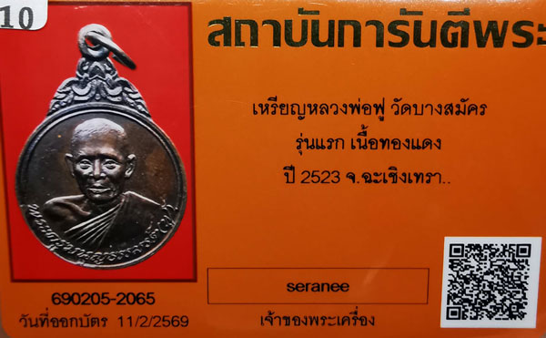 เหรียญหลวงพ่อฟู วัดบางสมัคร รุ่นแรก เนื้อทองแดง ห่วงเดิม ปี2523 จ.ฉะเชิงเทรา + บัตรG-pra สภาพสวยเดิมค่ะ |