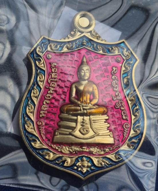 เหรียญโล่ห์ หลวงพ่อโสธร รุ่นเจ้าสัว ปลุกเสกติดต่อกัน5วันเกจิ500กว่ารูป เนื้อสัตตะโลหะลงยาพื้นชมพู สร้างน้อย175เหรียญ เลข 144