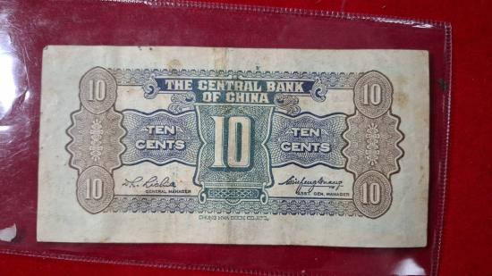 ธนบัตรโบราณมูลค่า 10 เซนต์ (1 เจียว) ออกโดยธนาคารกลางแห่งประเทศจีน (The Central Bank of China) ยุคสมัย: เป็นธนบัตรที่ใช้ในช่วงปี ค.ศ. 1930 ถึง 1940 ในช่วงสาธารณรัฐจีน |