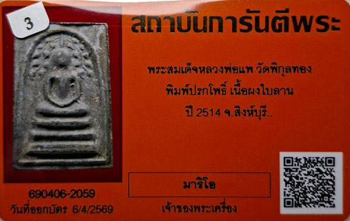 พระสมเด็จปรกโพธิ์ หลวงพ่อแพ วัดพิกุลทอง ( เนื้อผงใบลาน ปี 2514 จ.สิงห์บุรี |