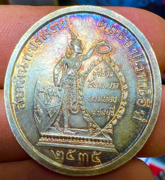 เหรียญรัชกาลที่ 5 ทรงยินดี ปี 2535 เนื้อเงิน ที่ระลึกสร้างโรงพยาบาลพานทอง ชลบุรี ปี 2535 เนื้อเงิน พิธีพุทธาภิเษกที่ยิ่งใหญ่