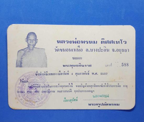 แผ่นประกาศนียบัตรประจำองค์พระรุ่น ติสสเทโว หลวงพ่อพรหมปลุกเ ส ก