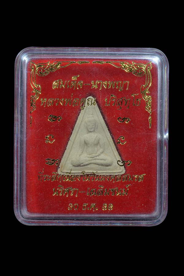 พระสมเด็จนางพญา รุ่น ฉลอง 700 ปี เชียงใหม่ ลุงสัมฤทธิ์ วัดพันอ้น ( เนื้อผง , เกศาหลวงพ่อคูณ ) พ.ศ.2538 ( กล่องบรรจุพระที่ระลึกเนื่องในงานมงคลสมรส วันที่ 30 ธันวาคม พ.ศ.2538 นริศ รา - เฉลิมชนม์ " )